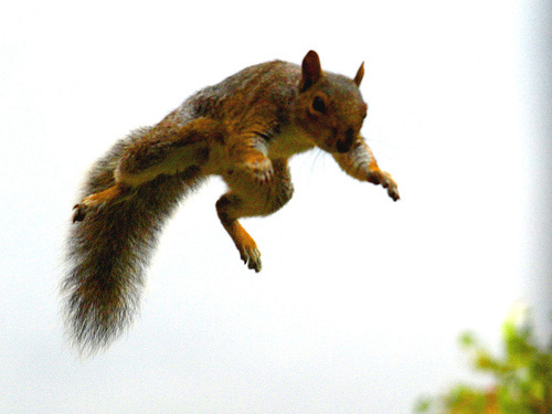 Last week I was sitting on the deck reading when something crashed right behind me. I whirled around to discover a squirrel sitting on the now-crushed plastic pot we use to store the garden hose. (Said pot did not survive.) Stunned, we looked at each other, separated by a mere two feet. That was too close for the both of us, so he took off. Two feet, people, two feet! Any closer and the squirrel would have landed on my head and scrambled for purchase and totally freaked me out and given me nightmares for life, not to mention possibly lice or nits or whatever might have been living on his furry self.