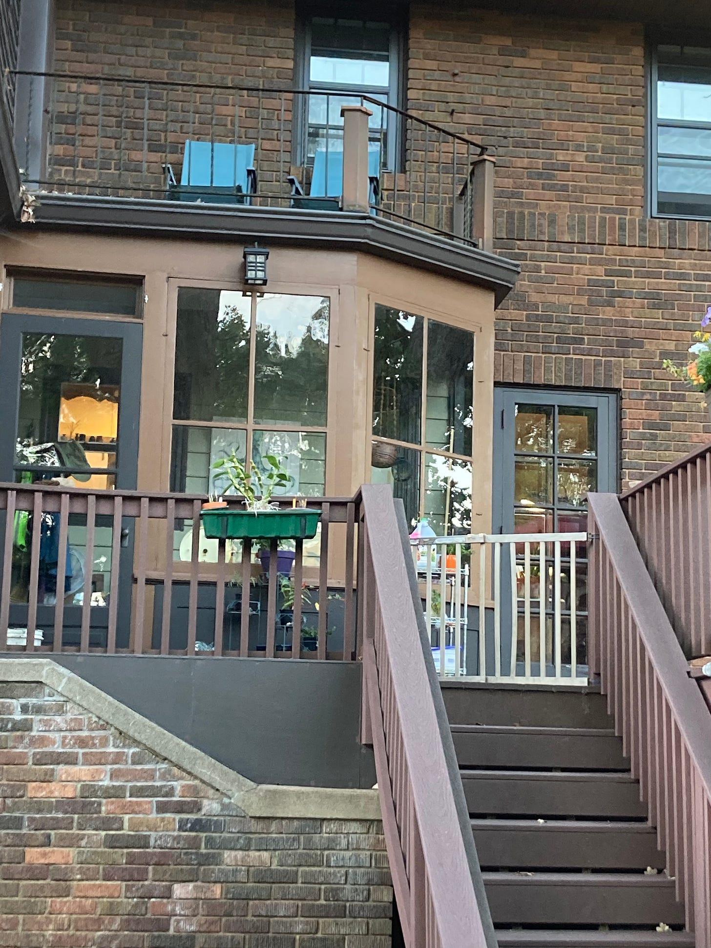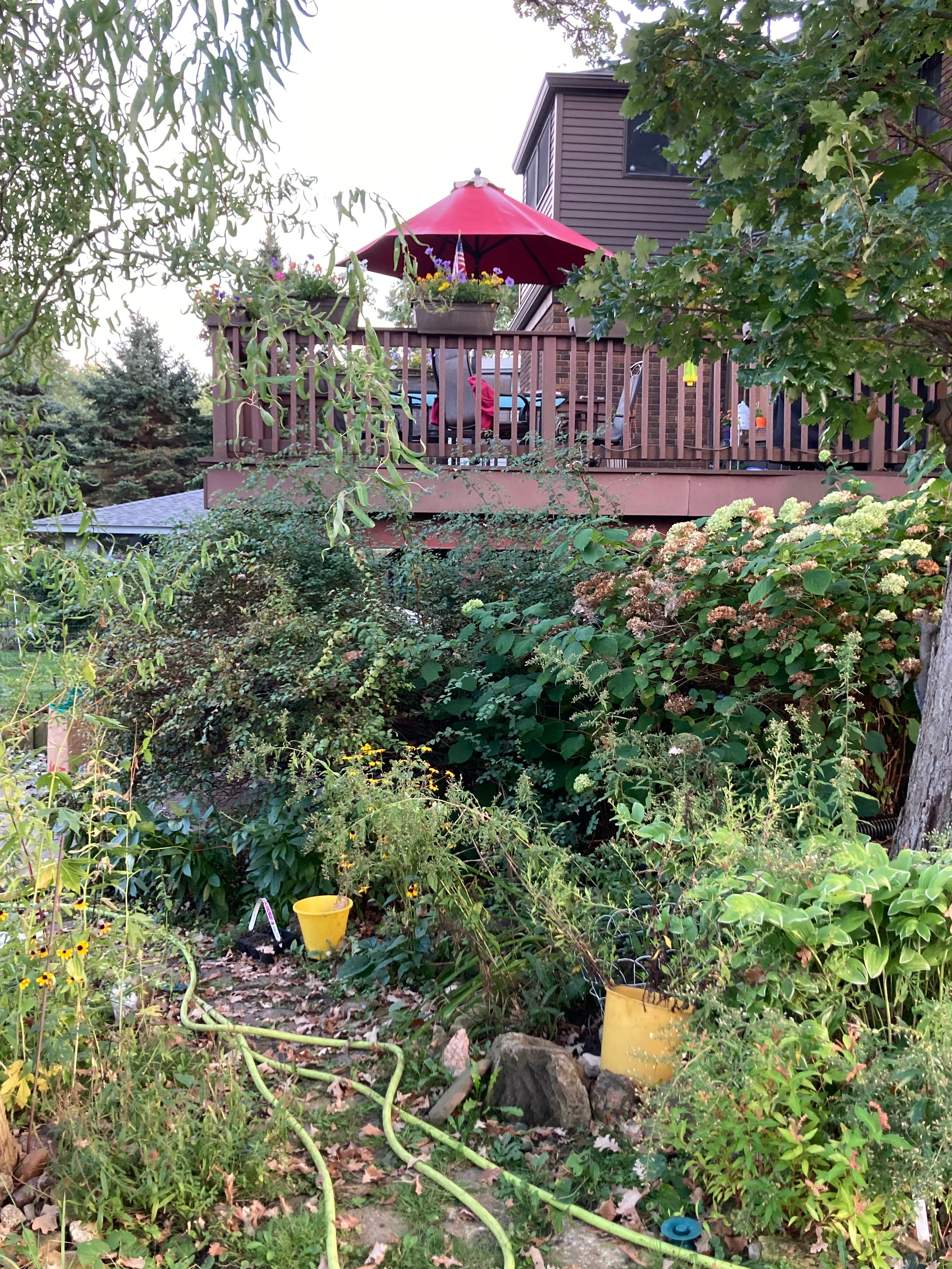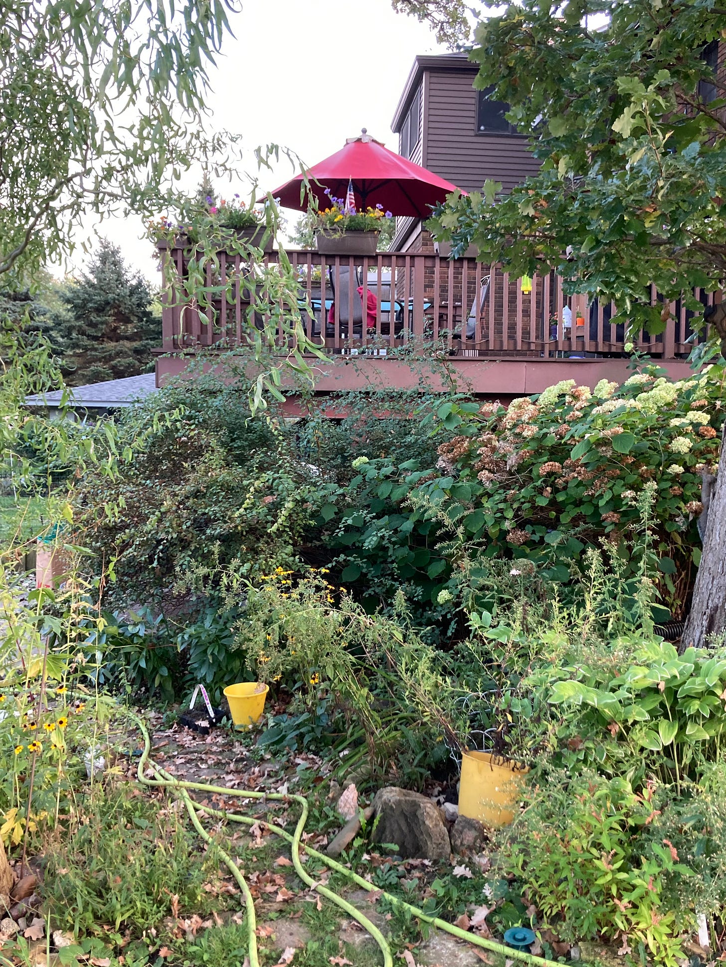 I’m the neighbor sitting up on the deck. I’m surrounded by big planters on the deck railings overflowing with annuals. I’m either reading or writing or playing with a tarot deck. When I sit on the deck, most people don’t even know I’m there!